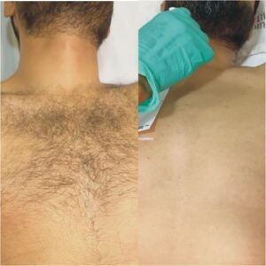 - Laser hair treatment targets dark coarse hairs while leaving the surrounding skin undamaged.