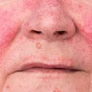 A condition that mostly affects the face skin and results in redness on the forehead, cheeks, chin, and nose. Rosacea is a chronic skin condition characterized by facial redness, visible blood vessels, and sometimes small, red, pus-filled bumps. It often affects the cheeks, nose, chin, and forehead and can flare up due to triggers like sunlight, stress, spicy foods, or alcohol.